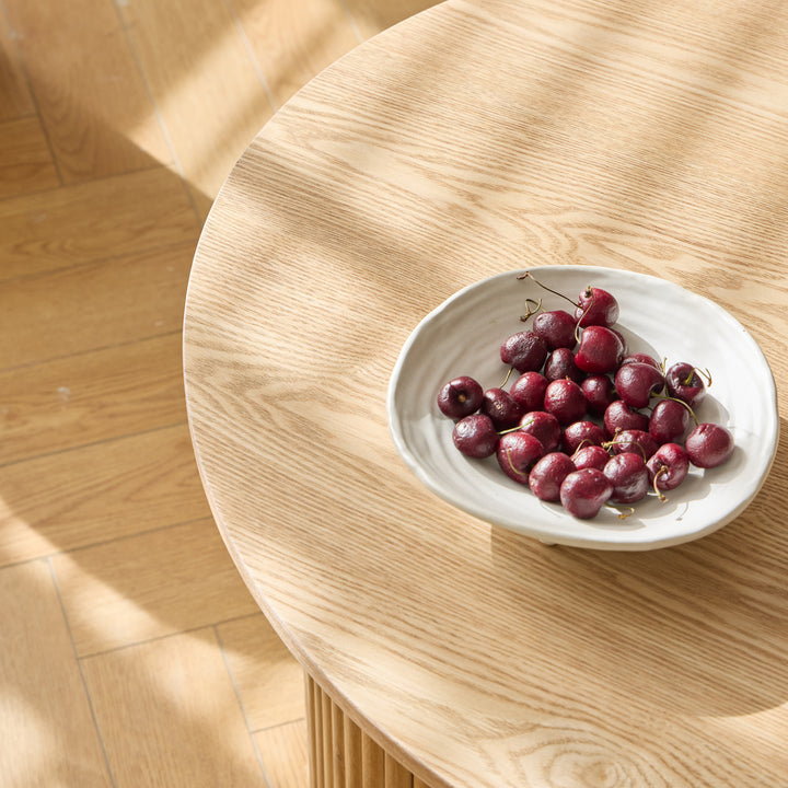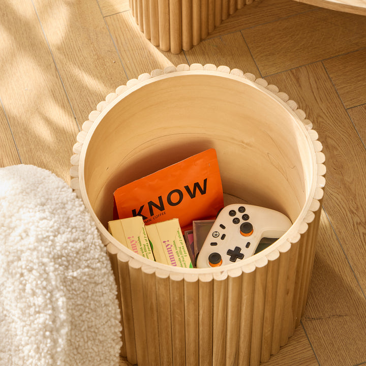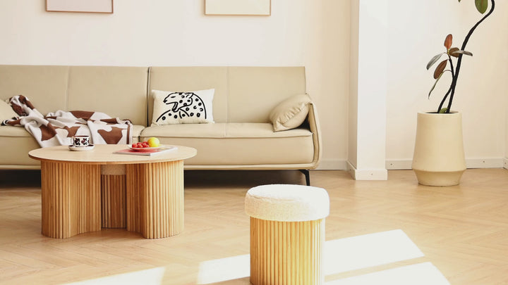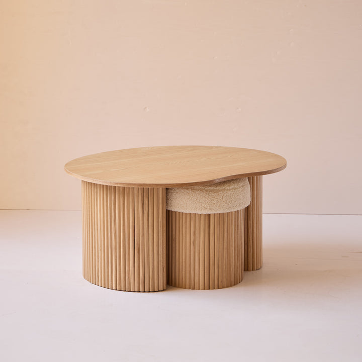 ARVIKA - Set d'une table basse en bois et 2 poufs en bouclettes blanches