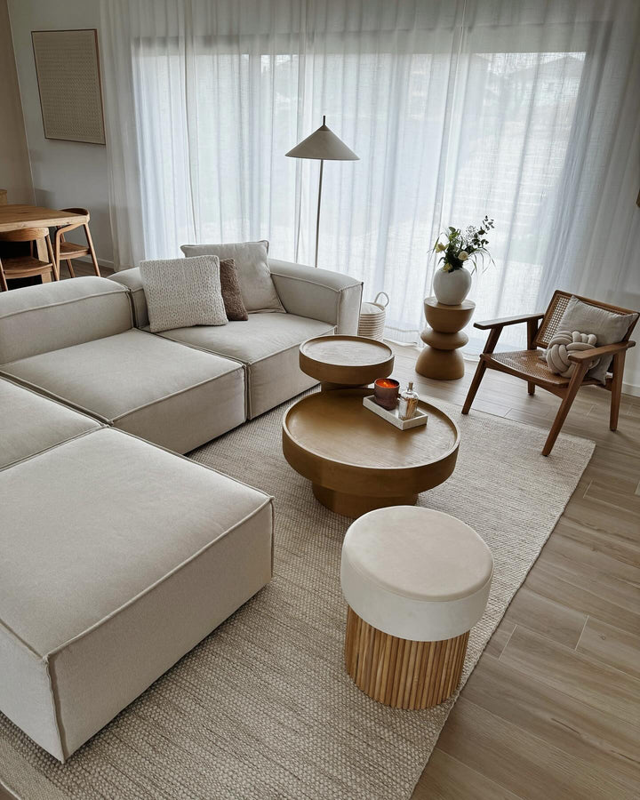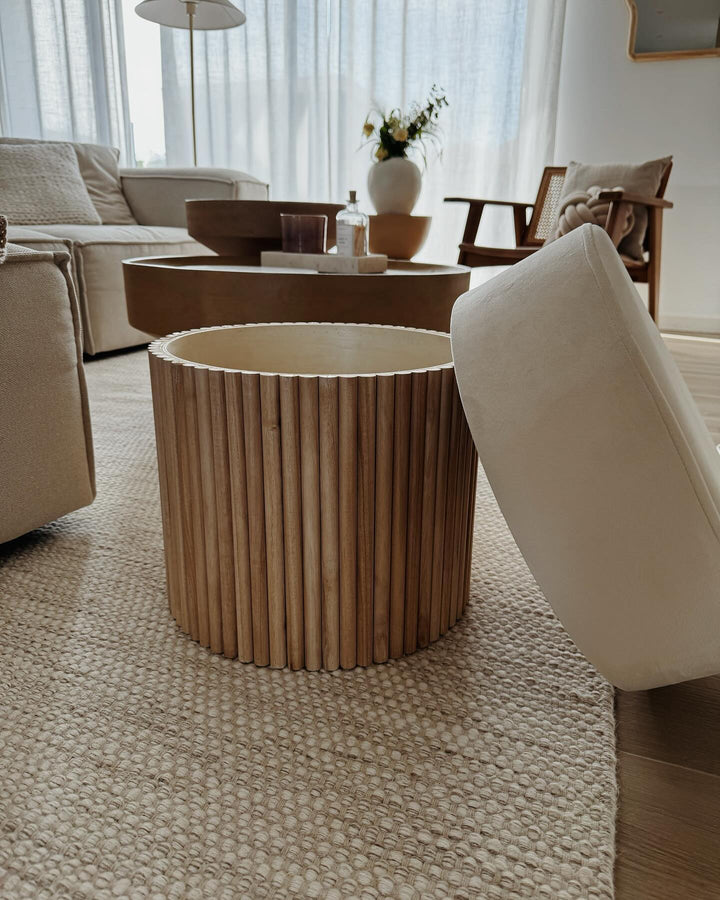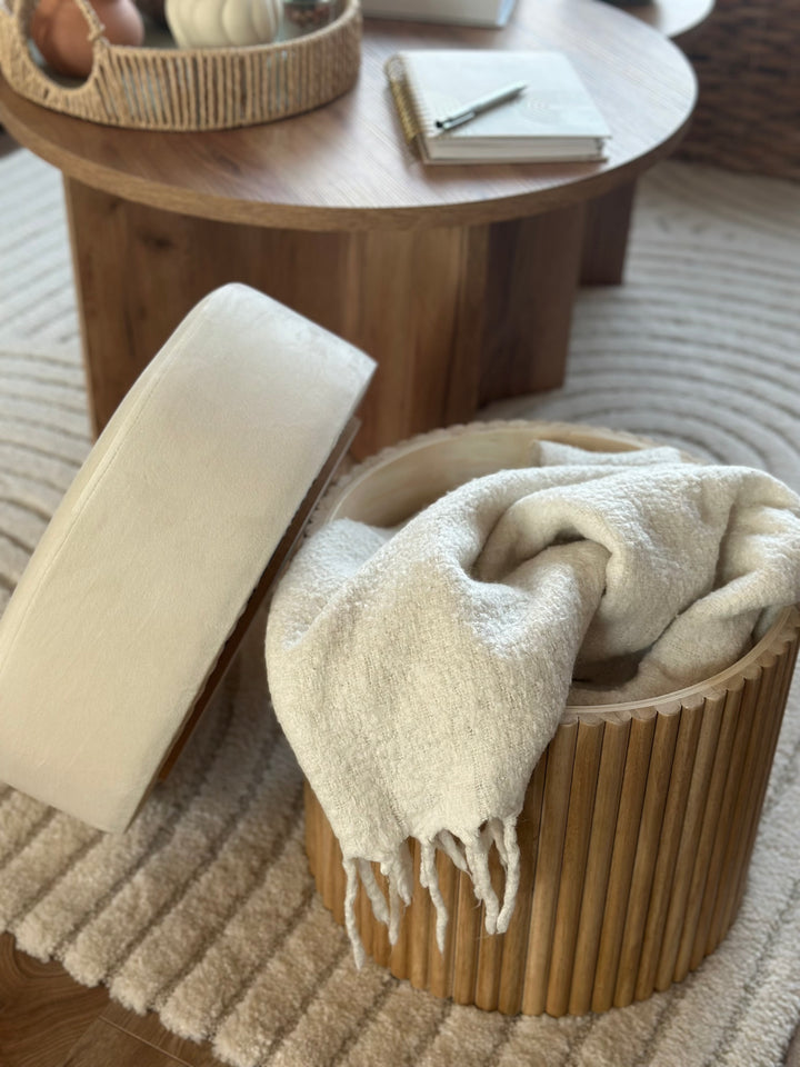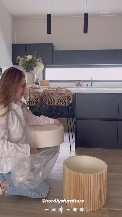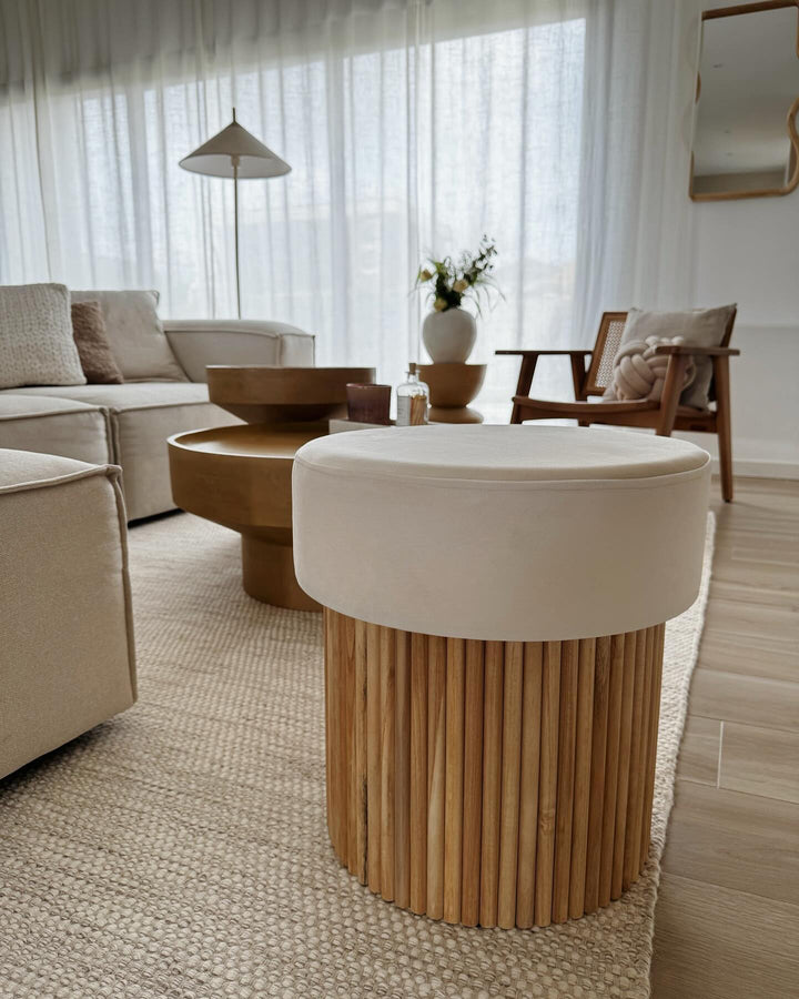 OTSU - Pouf en velours beige et base en bois